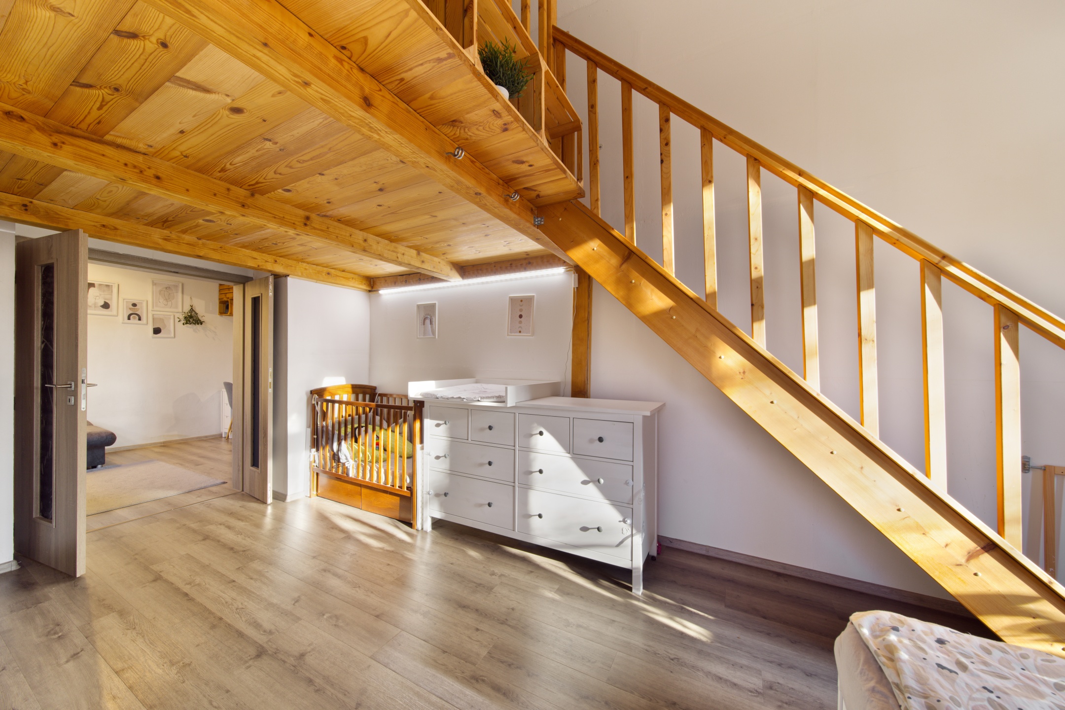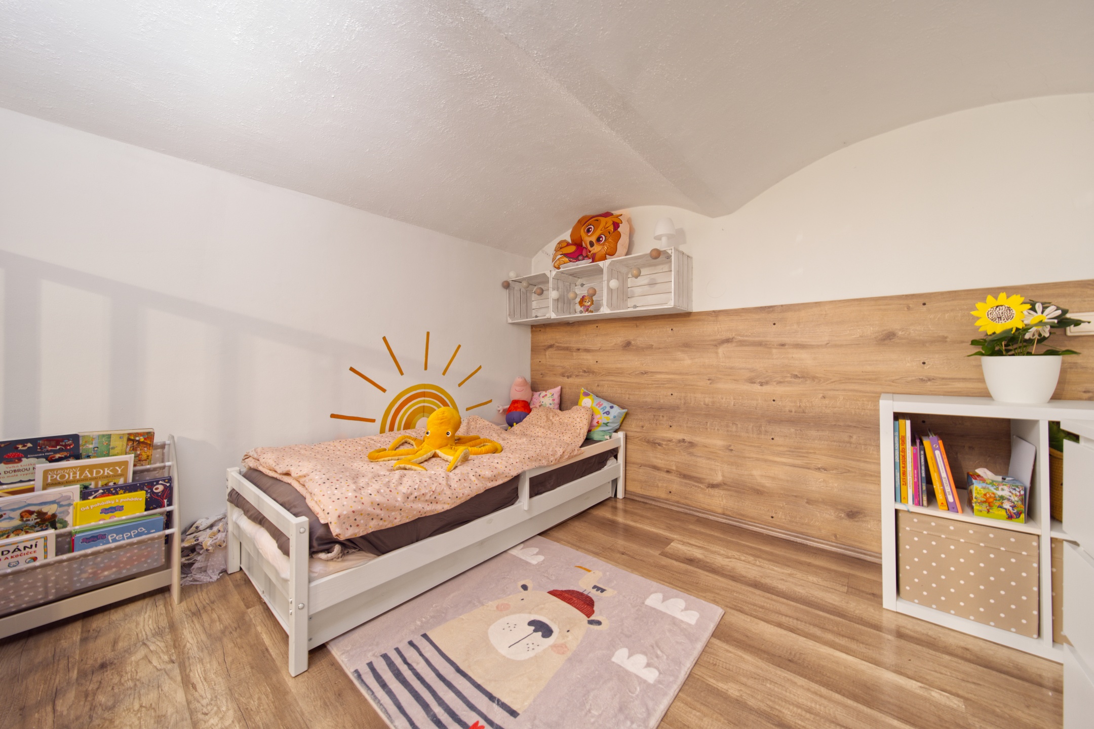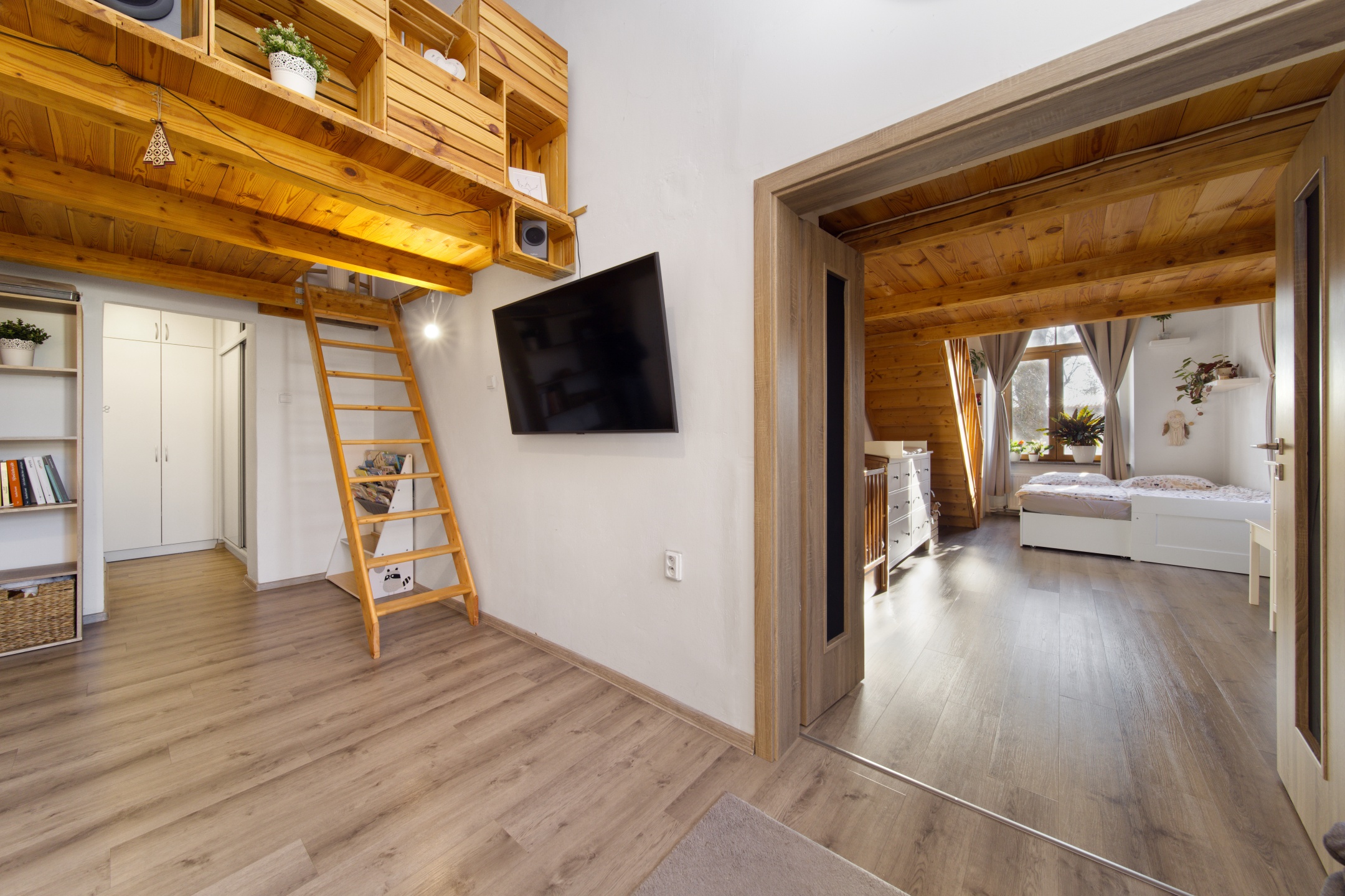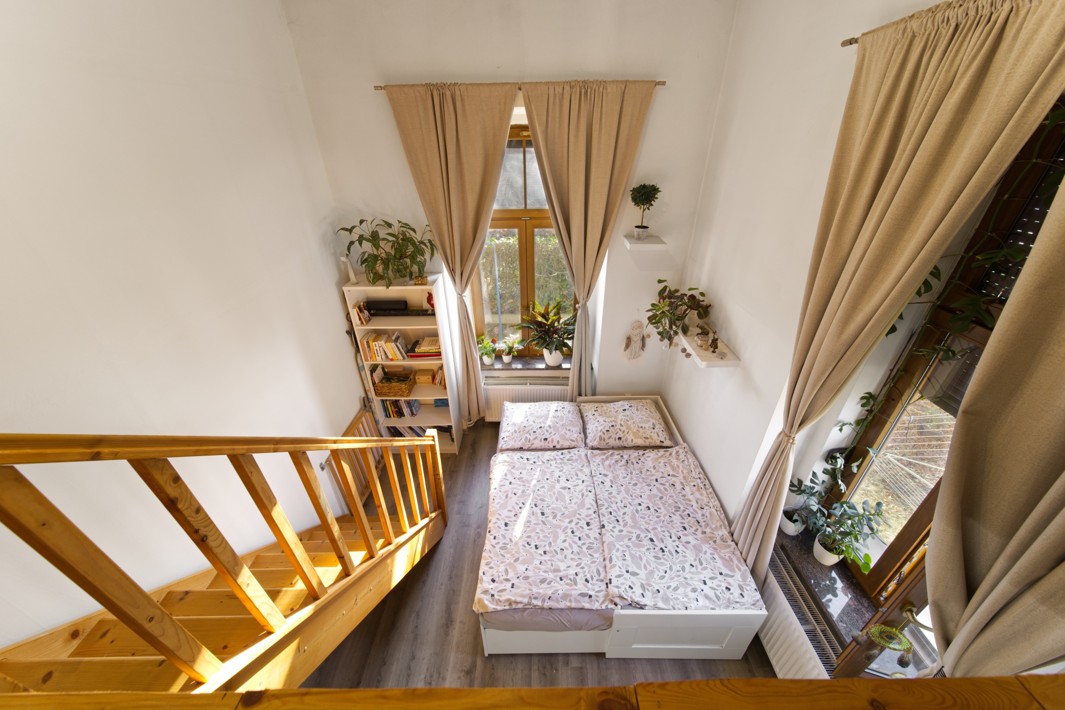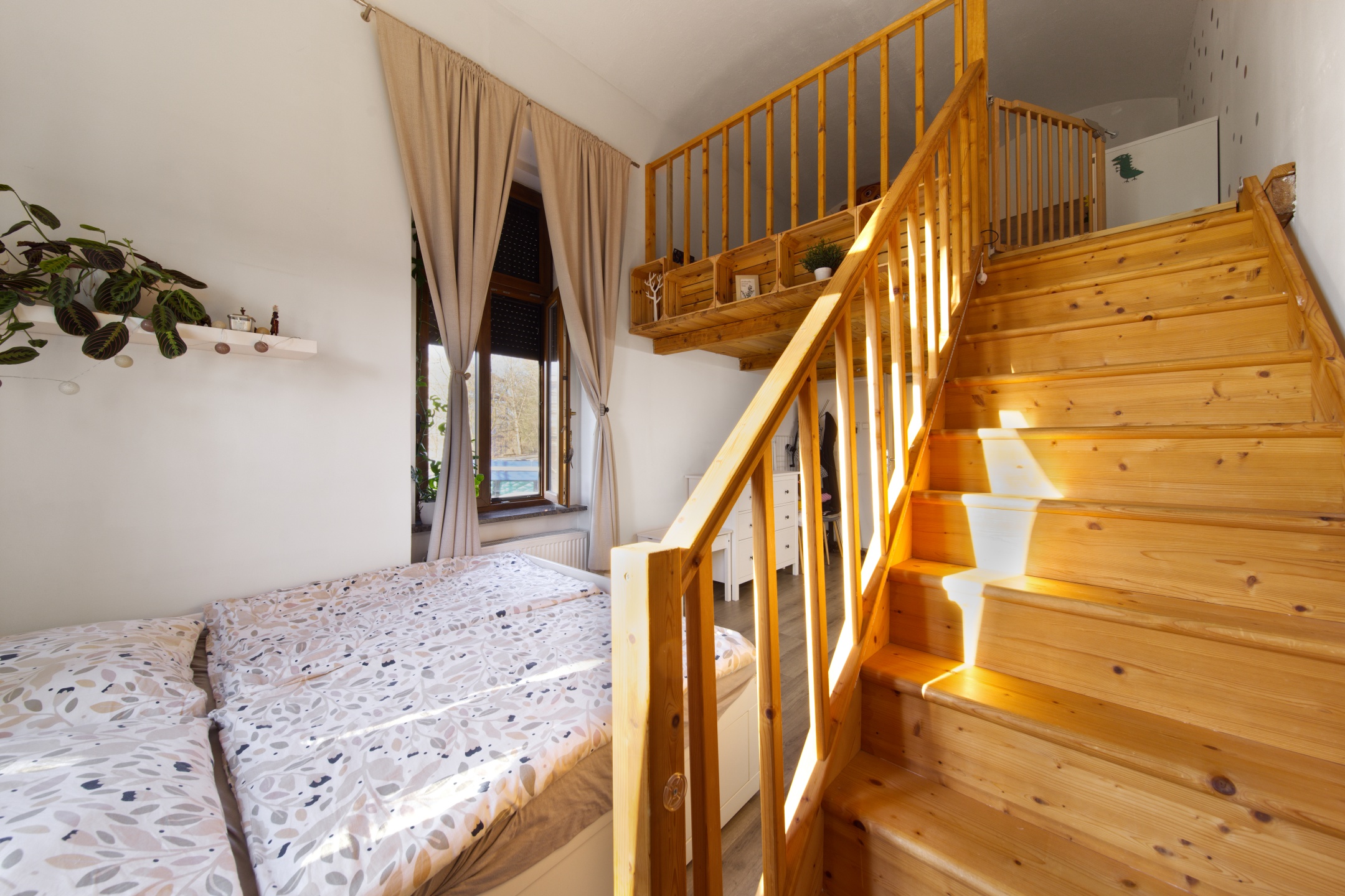 V každém pokoji jsou, díky vysokým stropům, vestavěny mezonety, každý o velikosti 10 m2.